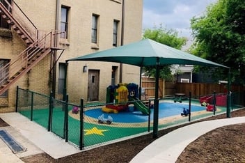 Even small changes can make a big difference. For this particular project (images below), we replaced the engineered wood fiber with poured-in-place rubber surfacing. This custom design expanded the potential use of the enclosed area, even including a trike track where children can exercise their imaginations while enjoying the riding toys.